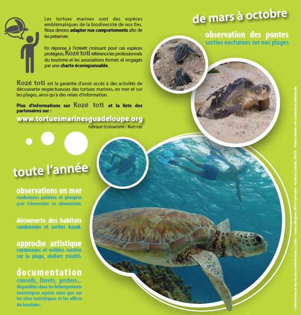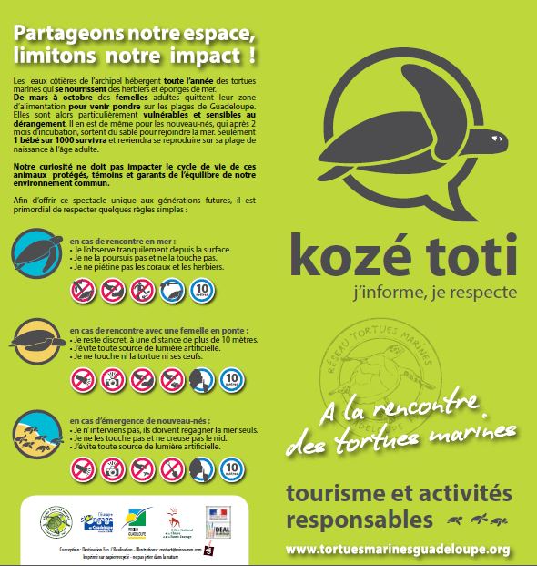 KOZE TOTI est un programme initié par le Réseau Tortues Marines de Guadeloupe qui vise à soutenir et promouvoir le développement d’activités touristiques responsables et respectueuses des tortues marines et de leurs habitats.
