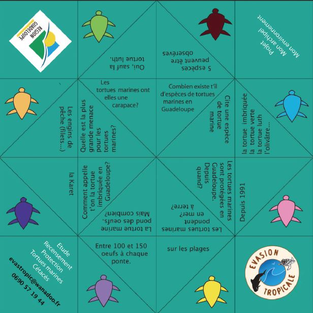 Développé́ par l’association Kap’Natirel, en partenariat avec de nombreuses associations du Réseau Tortues Marines Guadeloupe, le Kit pédagogique, sous la forme d’un classeur, propose de nombreuses activités et jeux pouvant être utilisés dans le cadre d’activités scolaires ou d’animations nature. Le célèbre « jeu de l’oie » version tortues marines a même été́ développé pour apprendre en jouant sur la plage.