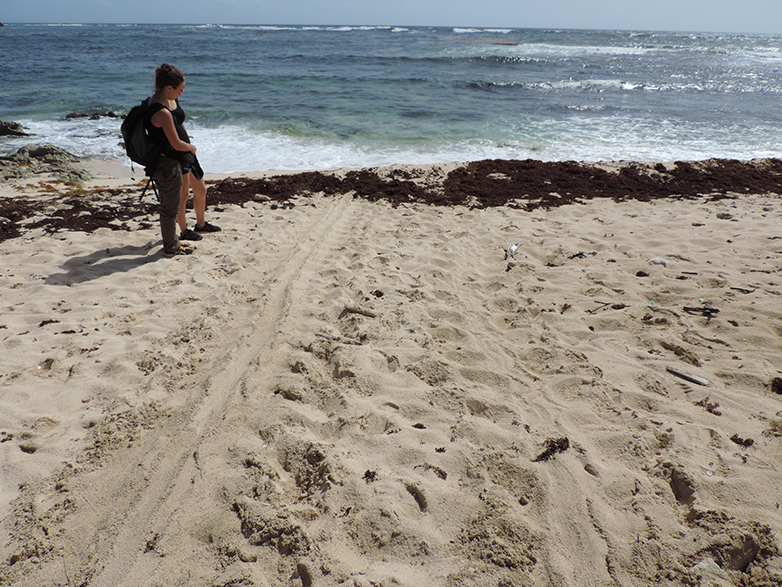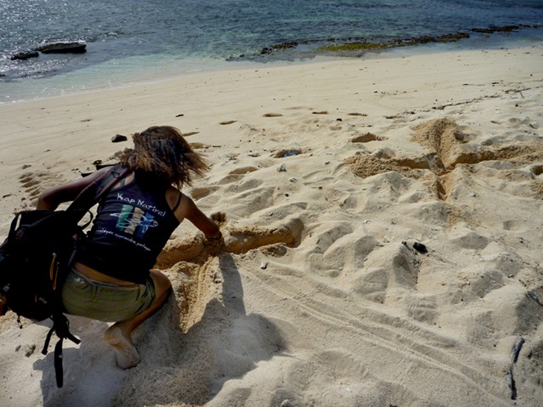 Ce travail consiste à inspecter de jour une plage plusieurs fois par semaine pendant la saison de pontes des tortues marines afin de comptabiliser et interpréter les activités (traces, nids) repérées. A partir de ces observations, il est possible de connaître l’espèce et d’évaluer s’il y a eu succès de ponte ou non. Le comptage traces permet de comptabiliser par site, le nombre de pontes par espèce sur la saison.
