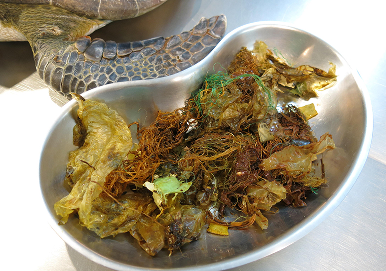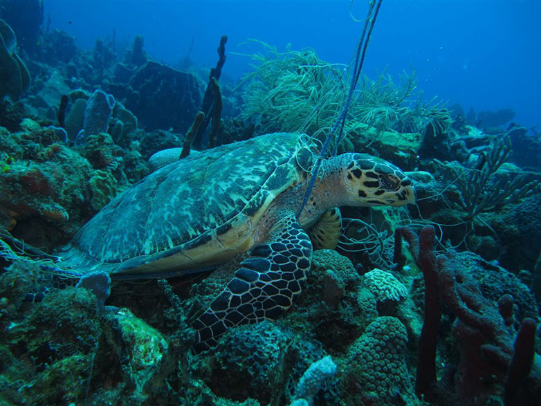 La présence de déchets comme des plastiques ou autres cordages sont des sources de mortalité directes ou indirectes chez les tortues marines.