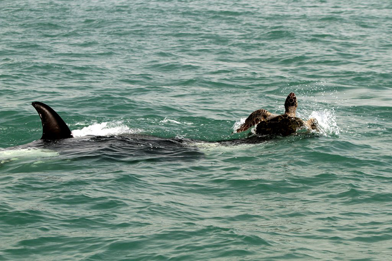 En mer, les jeunes tortues marines sont naturellement prédatées par des oiseaux ou des grands poissons pélagiques. Les requins ou les orques sont aussi de redoutables prédateurs, même pour des tortues d’âge adulte.